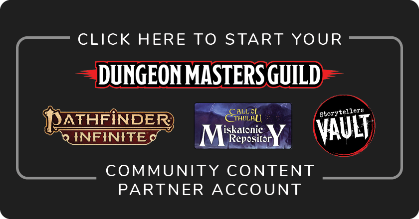 Looking to make content for Dungeon Masters Guild, Pathfinder Infinite, Miskatonic Repository, and more? Choose this option if you are creating a Community Content title. You do NOT need a Publishing Partner account and will publish directly through your own customer account.